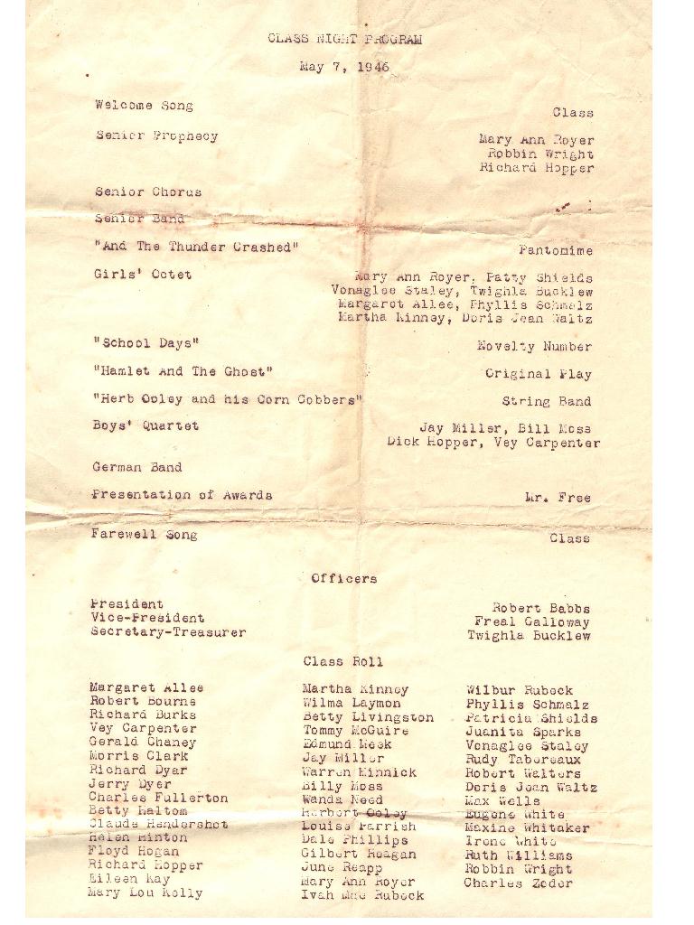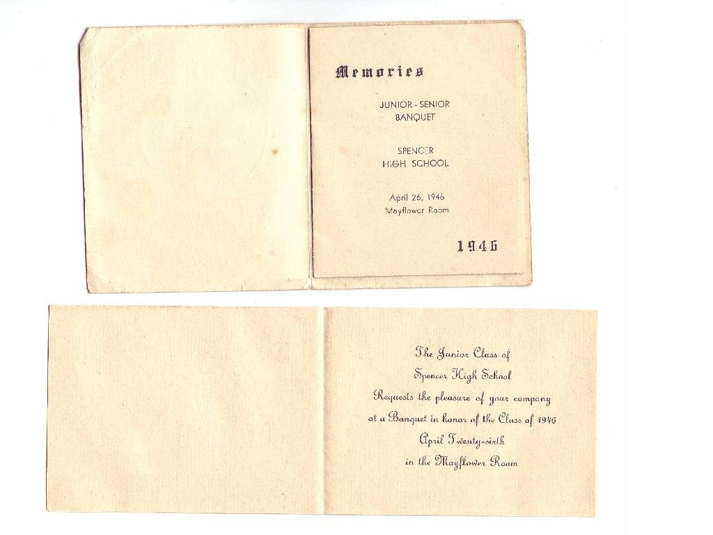 The items below are mementos from the Graduating Class of 1946 from Spencer High School. Nan White has submitted them and states that she has the 1946 SPENCER HIGH SCHOOL ANNUAL and that anyone wishing to have a photo from that book whether they were sophomore, junior or senior to just contact her at Nan White and she will gladly scan and send an image to them.Please be kind in your requests and not overwhelm her. Don't contact her to send you a listing of all the names, this would be too time consuming- simply request if you know your relatives were there.
