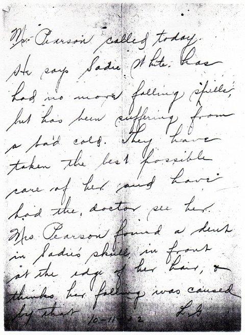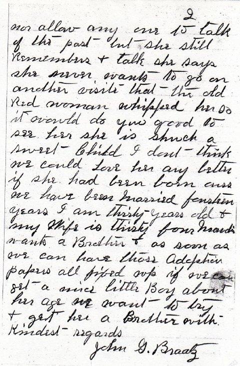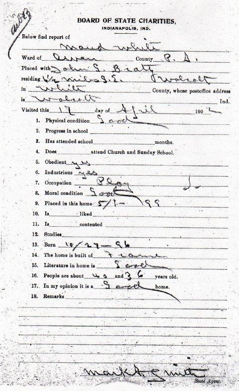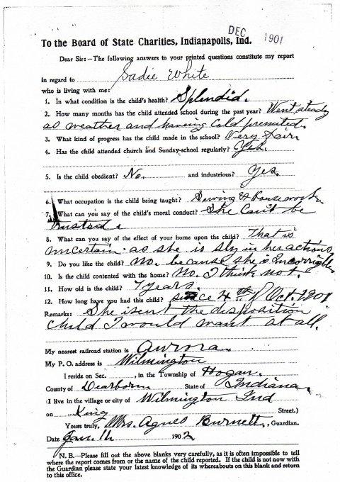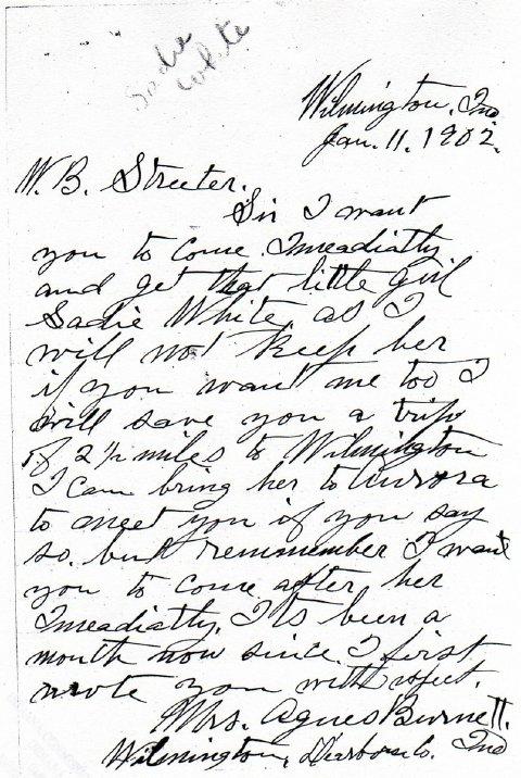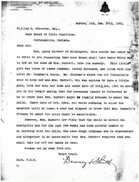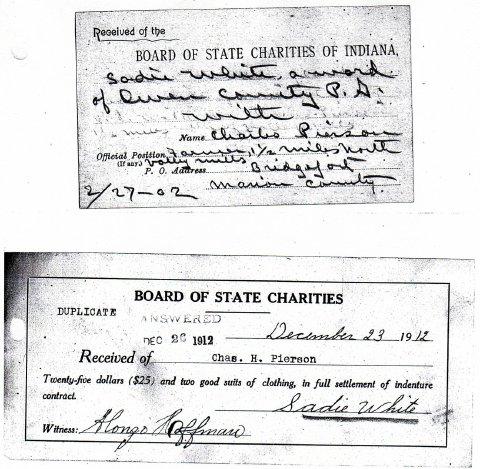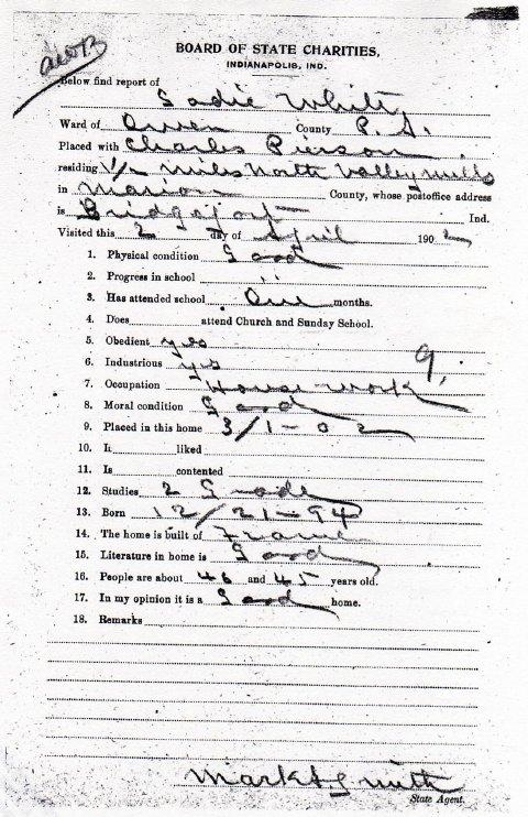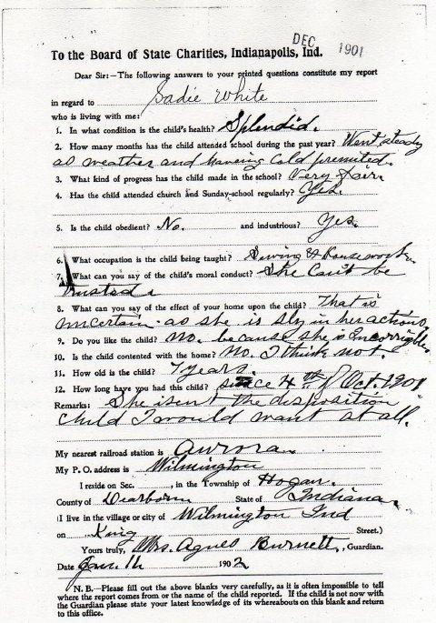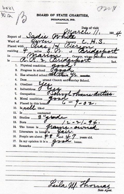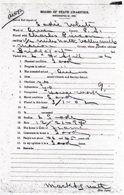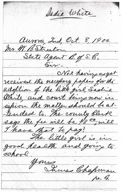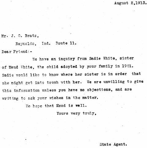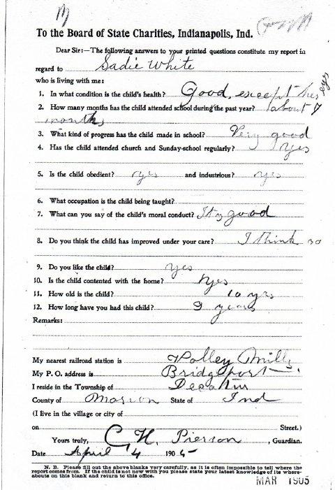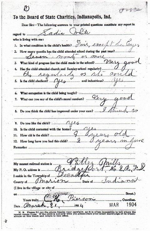 Sadie's Story-- Sadie however, was not as lucky. The plans of the first family to want to adopt Sadie was perhaps the reasoning for her whirlwind of prospective parents. The prospective adoptive father died shortly after Sadie's arrival. The widow (living in Dearborn County) then gave Sadie to another woman who wished to adopt a child. By this time it was the year 1900. In reality however, the second woman simply wanted a child to utilize basically as a servant to care for her and her parents. Various letters below document the woman's displeasure with the child. It would not be until the year 1902 that Sadie finally found her home with Mr. and Mrs. Charles Pierson in Valley Mills, Indiana just outside of Indianapolis. From various statements from the Pierson's it was obvious that the second woman who had so many problems with Sadie was the problem. Not the child. Sadie would later marry August Fuchs.