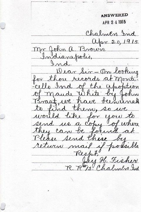 Maude's Story --Maude had been most fortunate in being placed in a new home not long after she became a Ward of the Owen County Court System. The letters from John Braatz give some picture as to just how much they truly loved her. It would not be until Maude was the age of 18 that she learned of her placement in the poorhouse and subsequent adoption. Her adoptive parents felt so strongly for her, they refused to let her know that she was not their own child. After her marriage to marriage to Jay Fisher in 1917, they searched for and located Sadie. Maude finally met her sister that she had not seen in almost 20 years and had no recollections of.