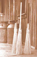 Once an art form, broom making has gone by the wayside as has many other of the handcrafts. Brooms have been used for centuries to sweep caves, cabins and castles. Before 1797, brooms in America were home and hand-made. Tree branches and brush were often used to sweep the floor and clean the ashes from the fireplaces. Sometimes a crude brooms were fashioned by tying something on a stick or handle: straw, hay, fine twigs or corn husks. These crude brooms did not sweep well and fell apart after a short time, even though strong linen twine was often used.