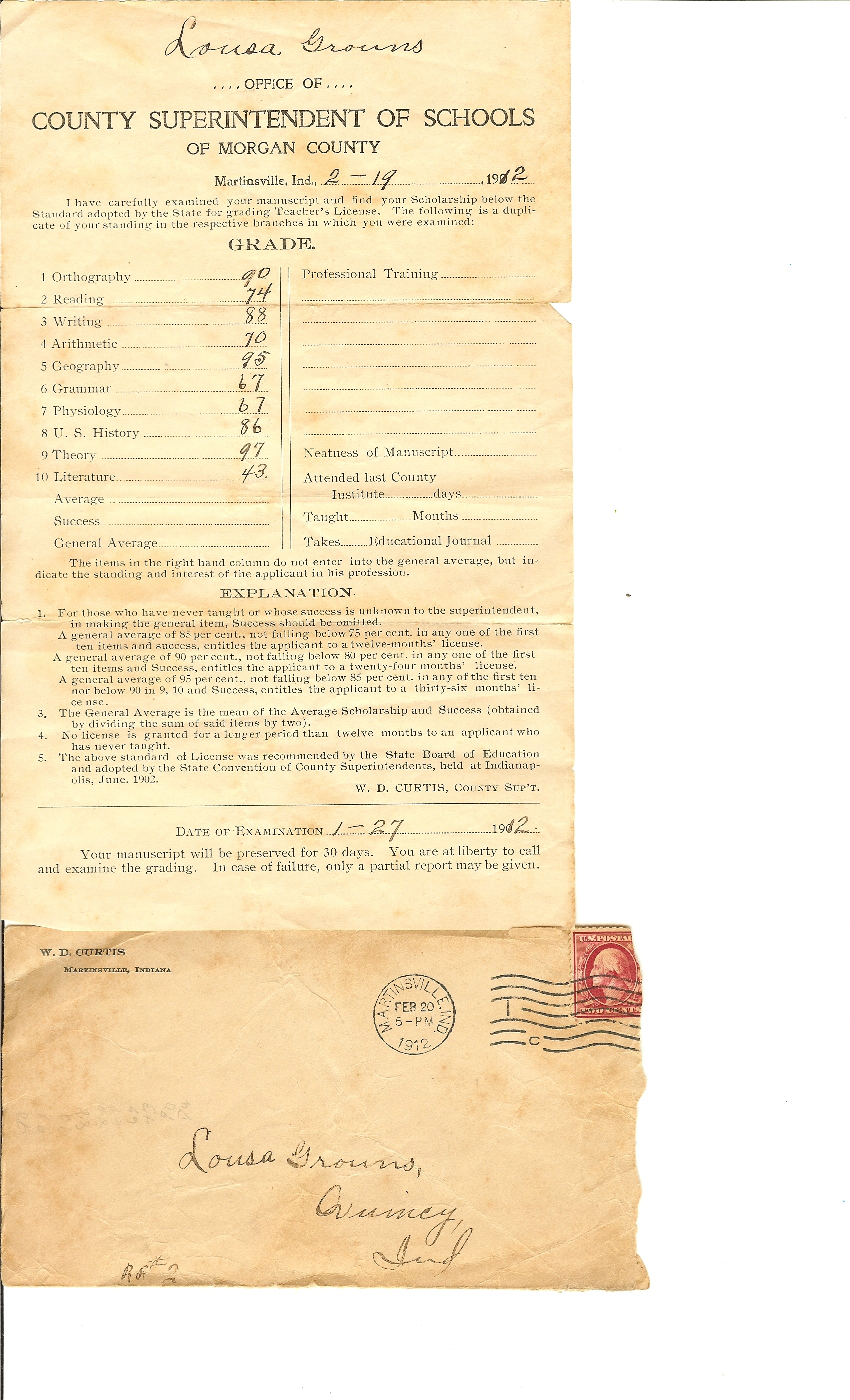 A few days ago a researcher, Jeff Hearns contacted me regarding an interesting genealogical find that he and his wife had made. They had found what apparently was the letter received by a young woman in February of 1912. The letter is from the School Superintendent of Morgan County W.D. Curtis-- The letter was addressed to: