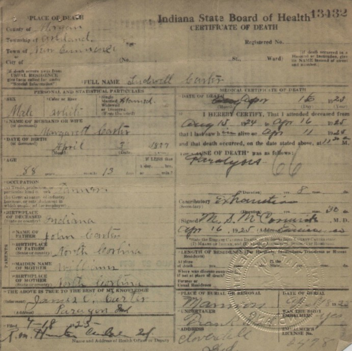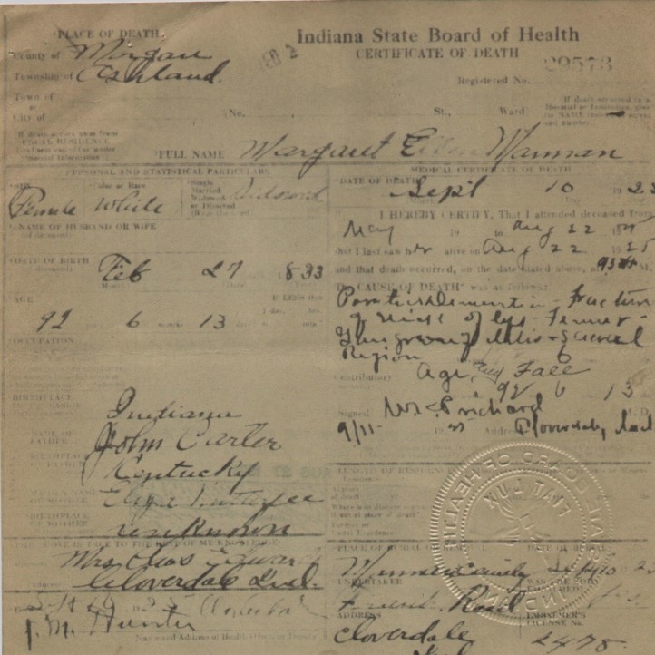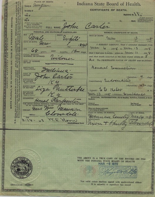 Morgan CountyDeath Certificates Page last link checked September 18, 2025 Margaret Ellen (Carter) Mannan Ludwell Carter John Stamper Carter Margaret E. Murphy William H. Murphy Owen County Certificates Putnam County Certificates