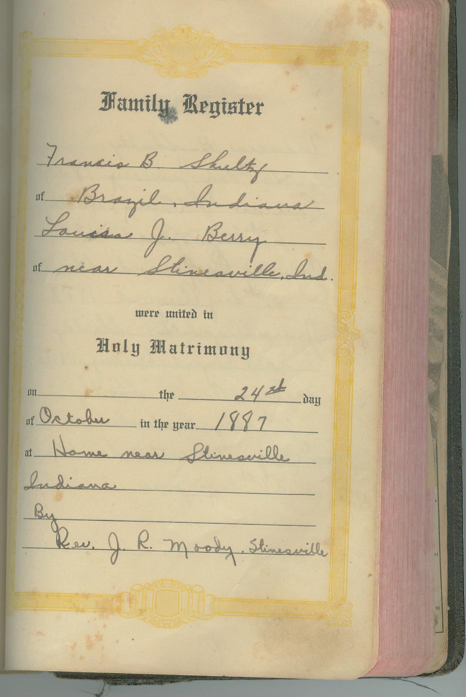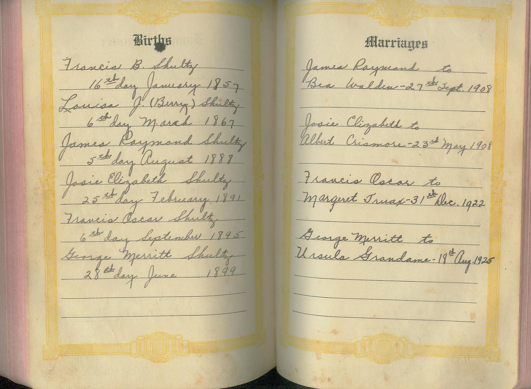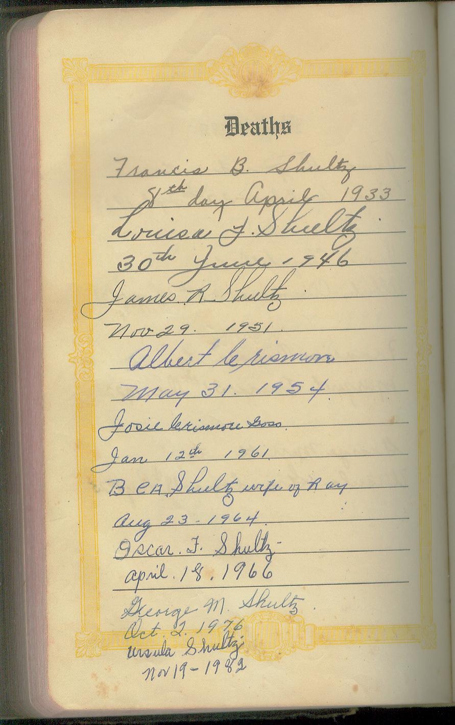 Family Bible ofFrancis & Louisa J. Shultz This page last updated January 10, 2022 These bible pages were generously donated by Mike Dean Main Page Births & Marriages Page Deaths Page Home Debbie Jennings Website Owner