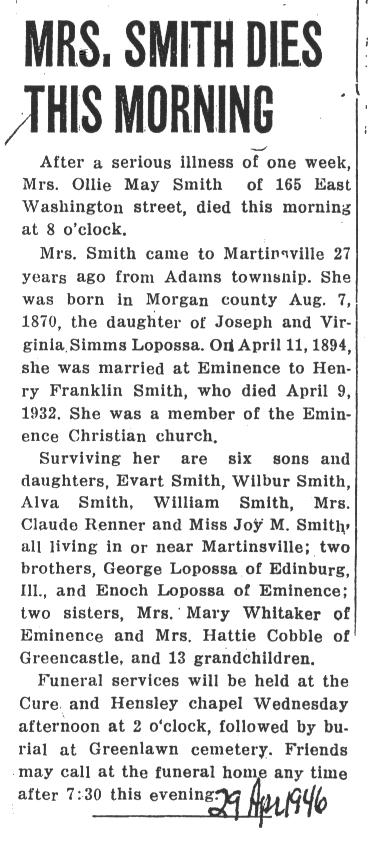 MR. GEORGE FRED SMITH died at Worchester, Mass., Sunday, November 14, aged 78 years. He was united in marriage with ELLA JOHNSON , daughter of ISAAC E. JOHNSON in 1870. He was a former engineer on the Vincennes R.R. The widow, five children and seven grandchildren survive him. They all reside in Massachusetts. Mr. and Mrs. Smith are well known to many of the older people of Spencer and Owen county. Posted by Kathy Bargerhuff
