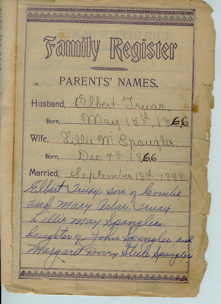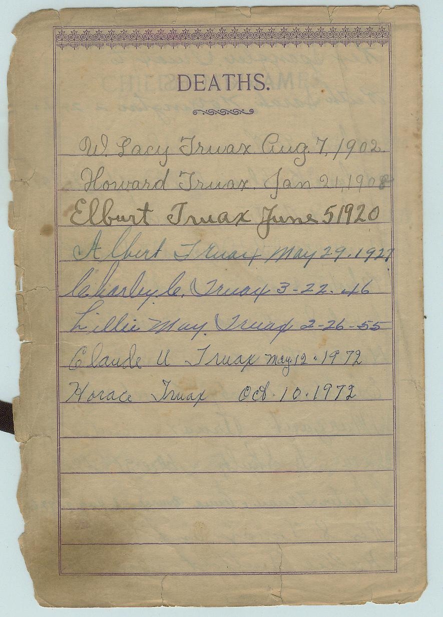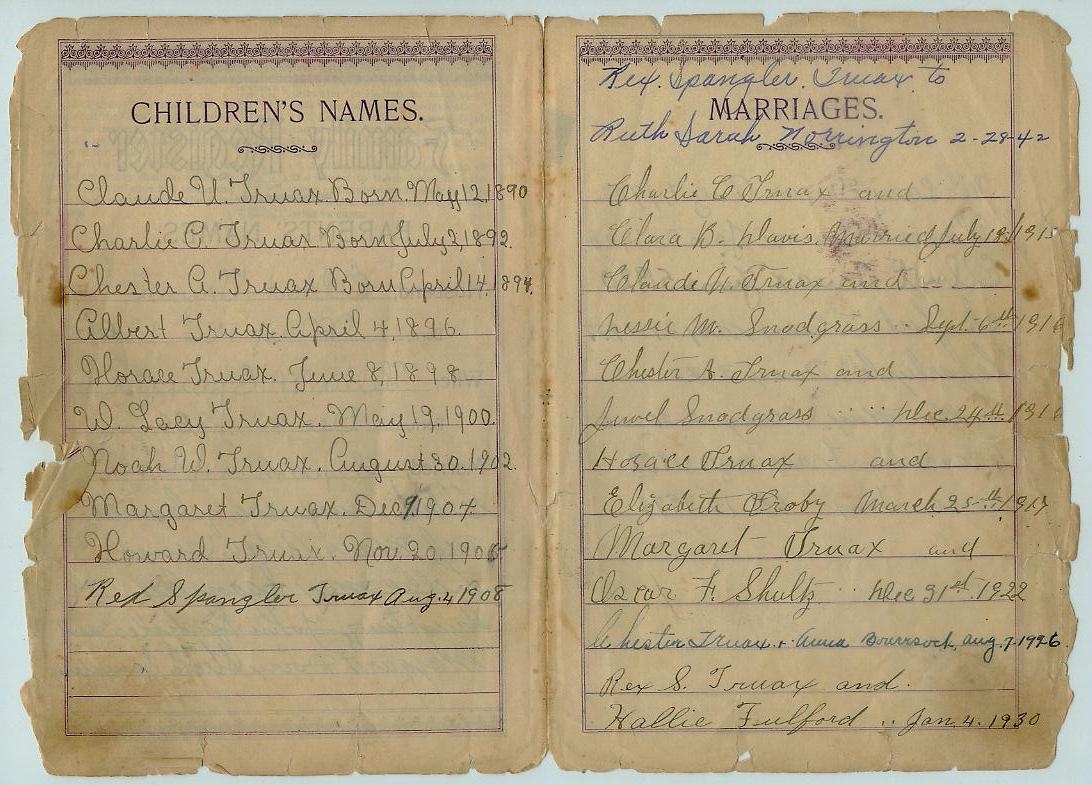 Family Bible ofLillie (Truax) Spangler This page last updated September 17, 2025 These bible pages were generously donated by Mike Dean Main Page Births & Marriages Page Deaths Page Home Debbie Jennings Website Owner