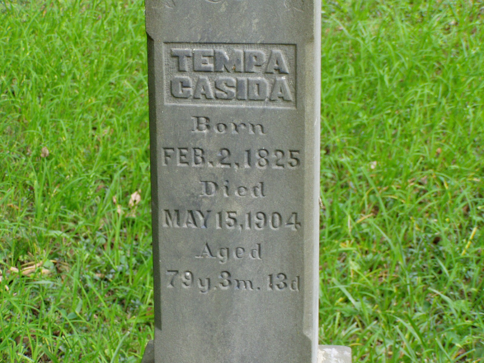 1. Tempa (Jordan) Casida Gravestone b. Feb 2, 1825 d. May 15, 1904 Aged 79y 3m 13d Daughter of Reuben and Nancy (Beaman) Jordan Tempa and Issac are on the same stone Place Taken: Pleasant Grove Cemetery
