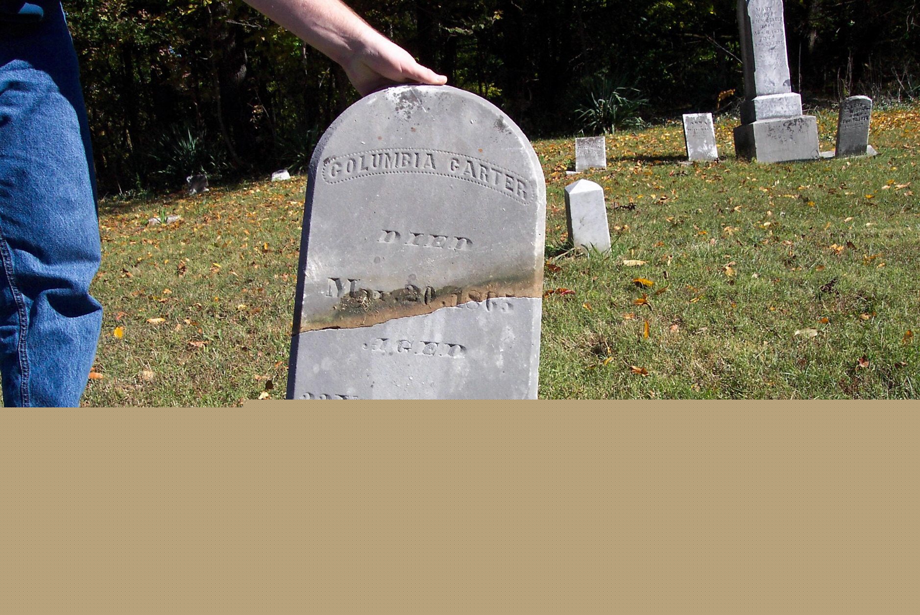3. Columbia Carter Gravestone Columbia Carter was the son of John Carter and Eliza Nutterfield. He married Sarah McDonald on August 29,1861 and he died of typhoid pneumonia and measles during the Civil War.