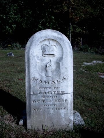 2. Mahala Carter Gravestone Mary Mahala (McCullough) Carter was the daughter of William and Sarah (Jackson) McCullough. She was the first wife of Ludwell Carter. Place Taken: Combes Cemetery